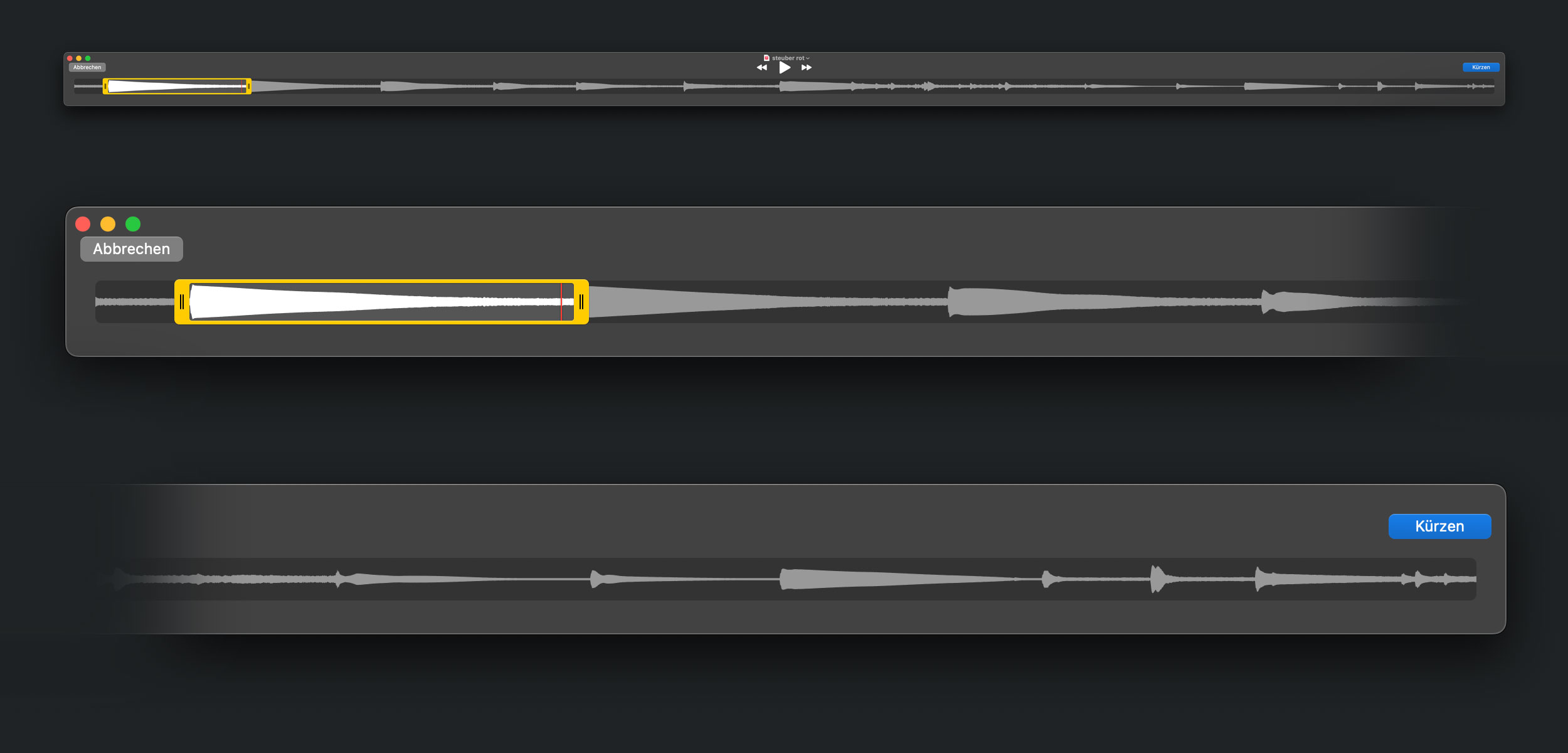 Über den Menüpunkt Bearbeiten > Kürzen …, bzw. das Tastaturkürzel cmd ⌘ + T wie „Trim“, erscheint um die Wellenform herum ein gelber Rahmen mit Anfassern am linken und rechten Ende. Verschiebt nun die Enden an den Ausschnitt, den ihr haben wollt und bestätigt mit einem Klick auf den Button „Kürzen“.