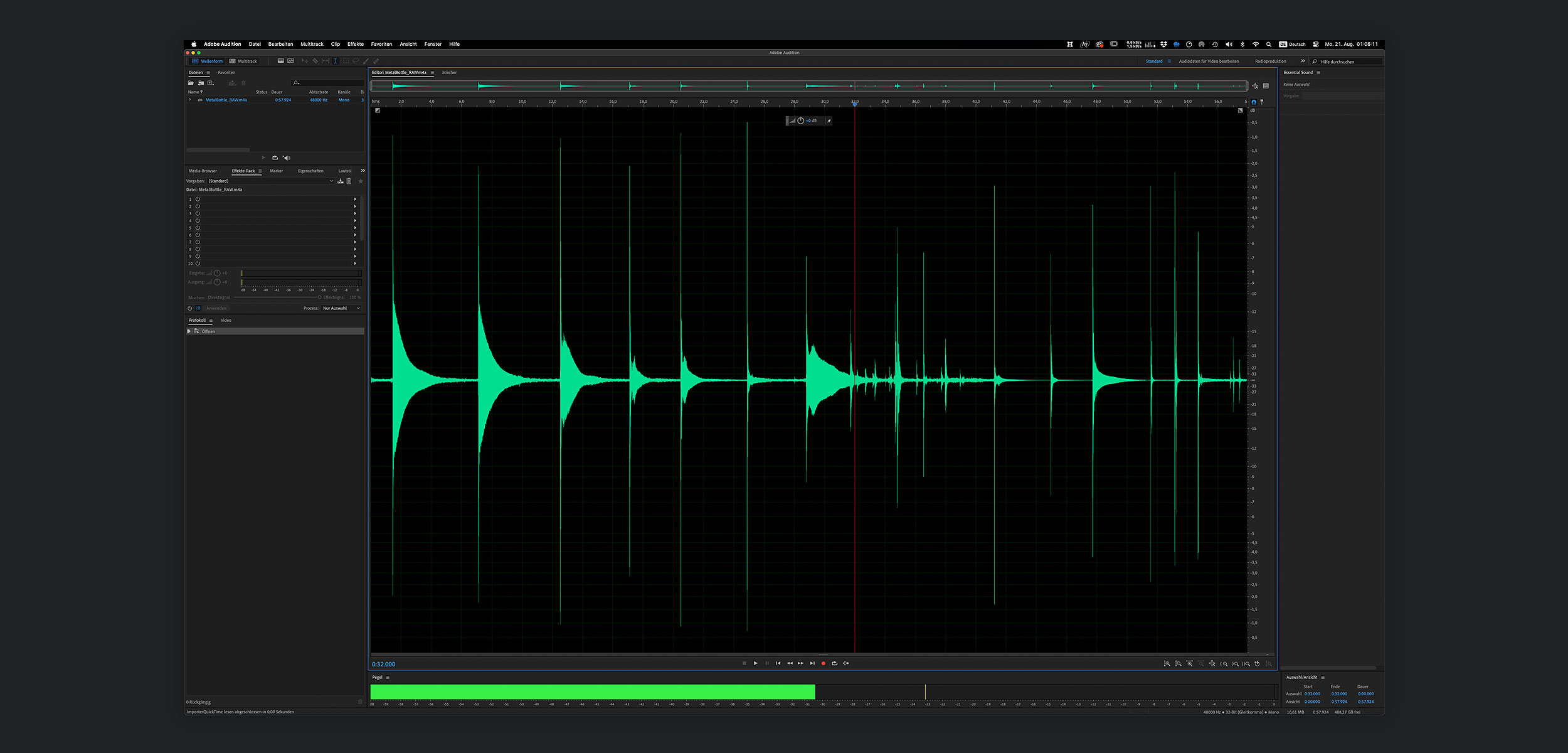 Die beiden Screenshots zeigen jeweils die komplette Roh-Datei und einen der Einzeltöne in der Anwendung Adobe Audition. Damit (und mit jedem anderen Audio-Editor) könnt ihr bei Bedarf auch andere Dateiformate wie zb. .wav oder .aiff erzeugen.